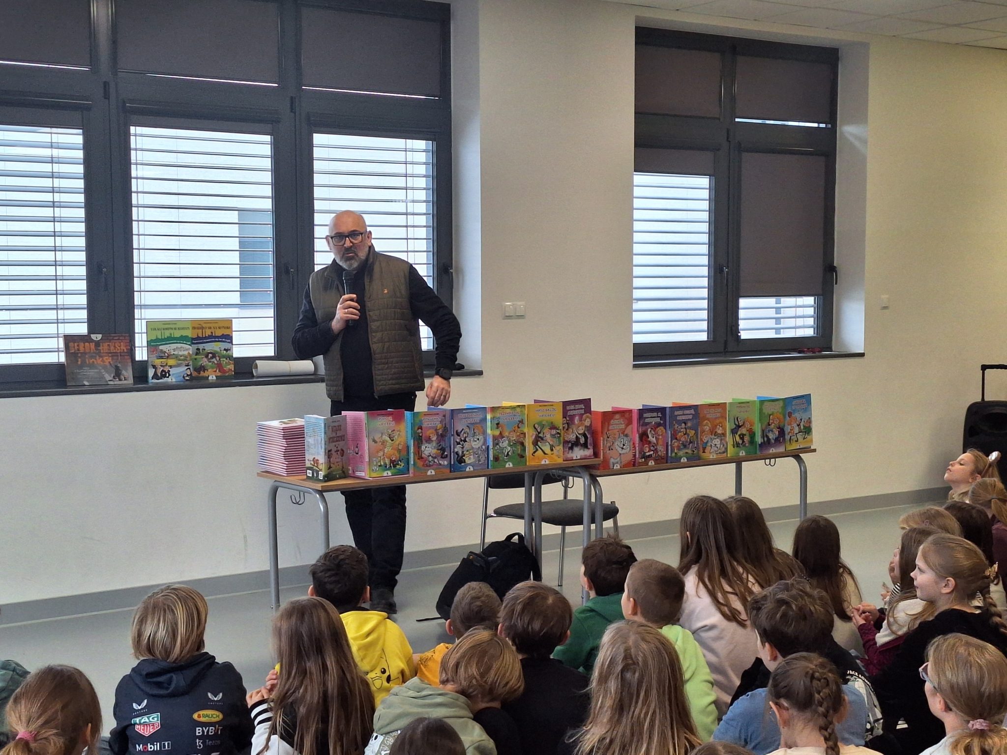 15 stycznia 2026r. w naszej szkole odbyło się spotkanie autorskie z Panem Waldemarem Cichoniem – autorem lektury szkolnej „Cukierku, Ty Łobuzie!”. W spotkaniu uczestniczyli uczniowie kl. 1 – 3. W czasie spotkania Pan Waldemar opowiadał o tym w jaki sposób przebiega proces pisania książki, od momentu powstania pomysłu w głowie,