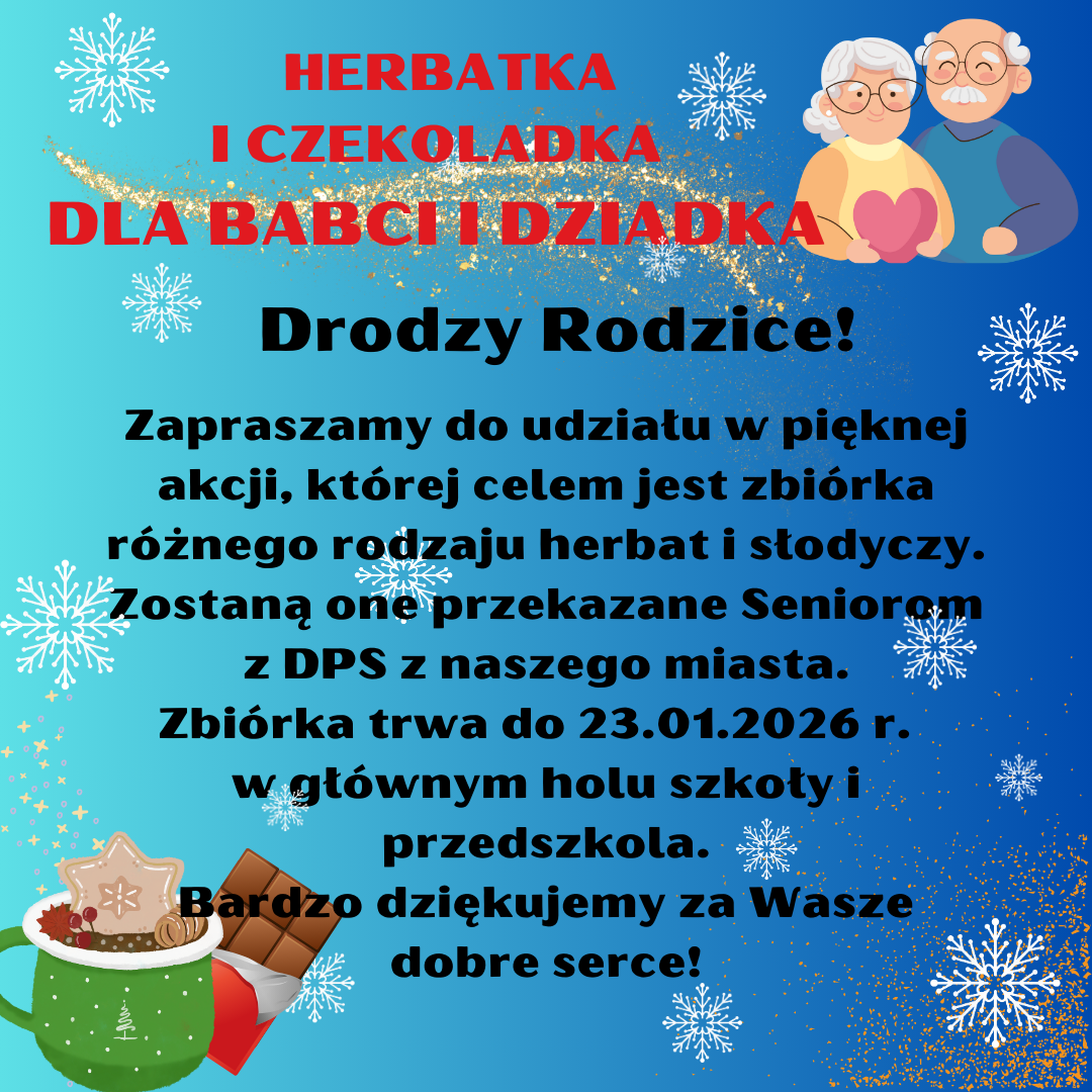 Szanowni Państwo, Zapraszamy do udziału w pięknej akcji, której celem jest zbiórka różnego rodzaju herbat i słodyczy. Zostaną one przekazane Seniorom z DPS z naszego miasta. Zbiórka trwa do 23.01.2026 r. w głównym holu szkoły orz przedszkola. Bardzo dziękujemy za Wasze dobre serce! Zachęcamy również do wykonania kartek świąteczno- noworocznych,