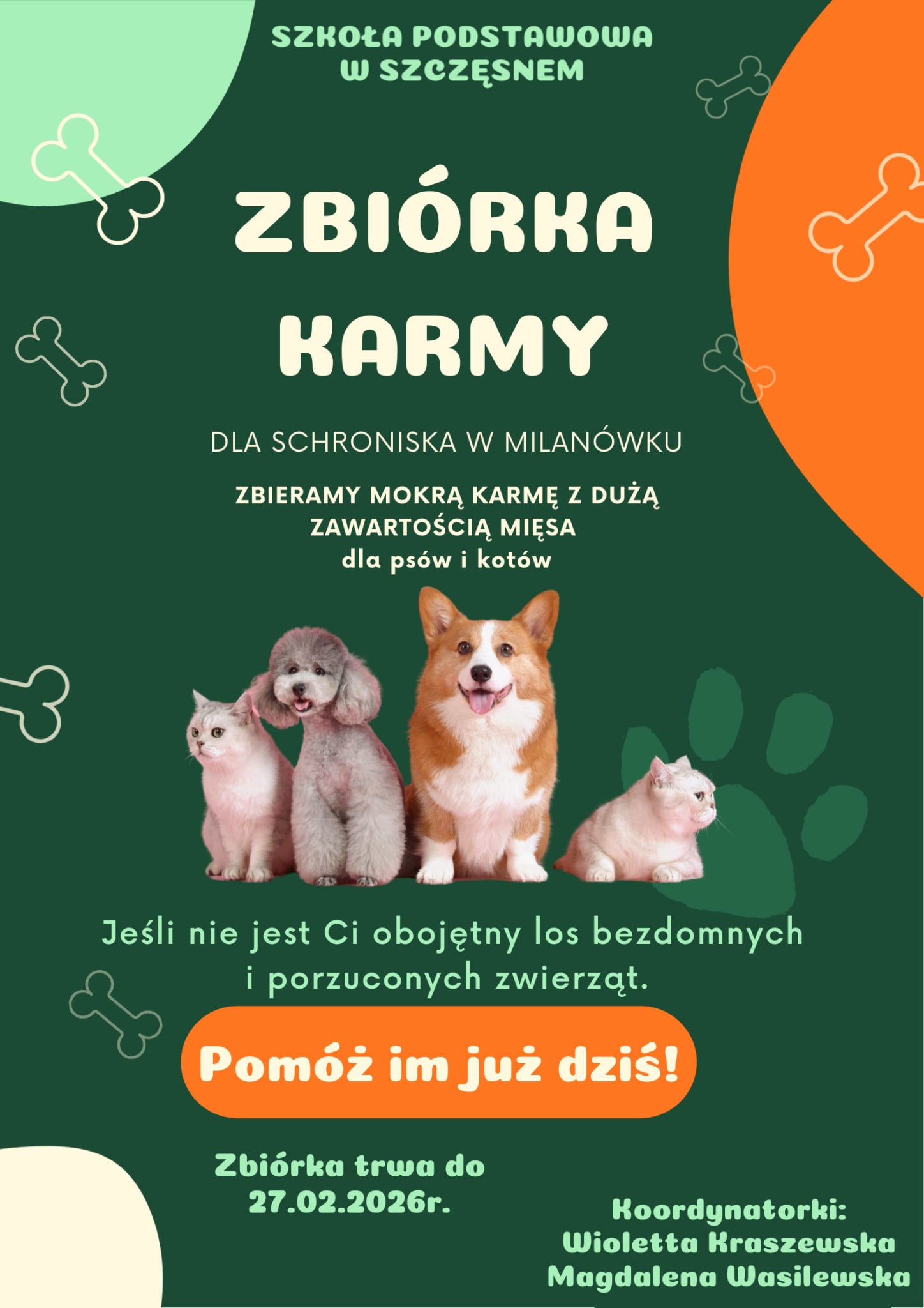Szkoła Podstawowa w Szczęsnem organizuje zbiórkę karmy dla bezdomnych i porzuconych zwierząt ze schroniska w Milanówku. Zbieramy mokrą karmę z dużą zawartością mięsa przeznaczoną dla psów i kotów. Każda puszka lub saszetka to realna pomoc dla zwierząt czekających na nowy dom. Termin zbiórki: do 27.02.2026 r. Jeśli nie jest Ci