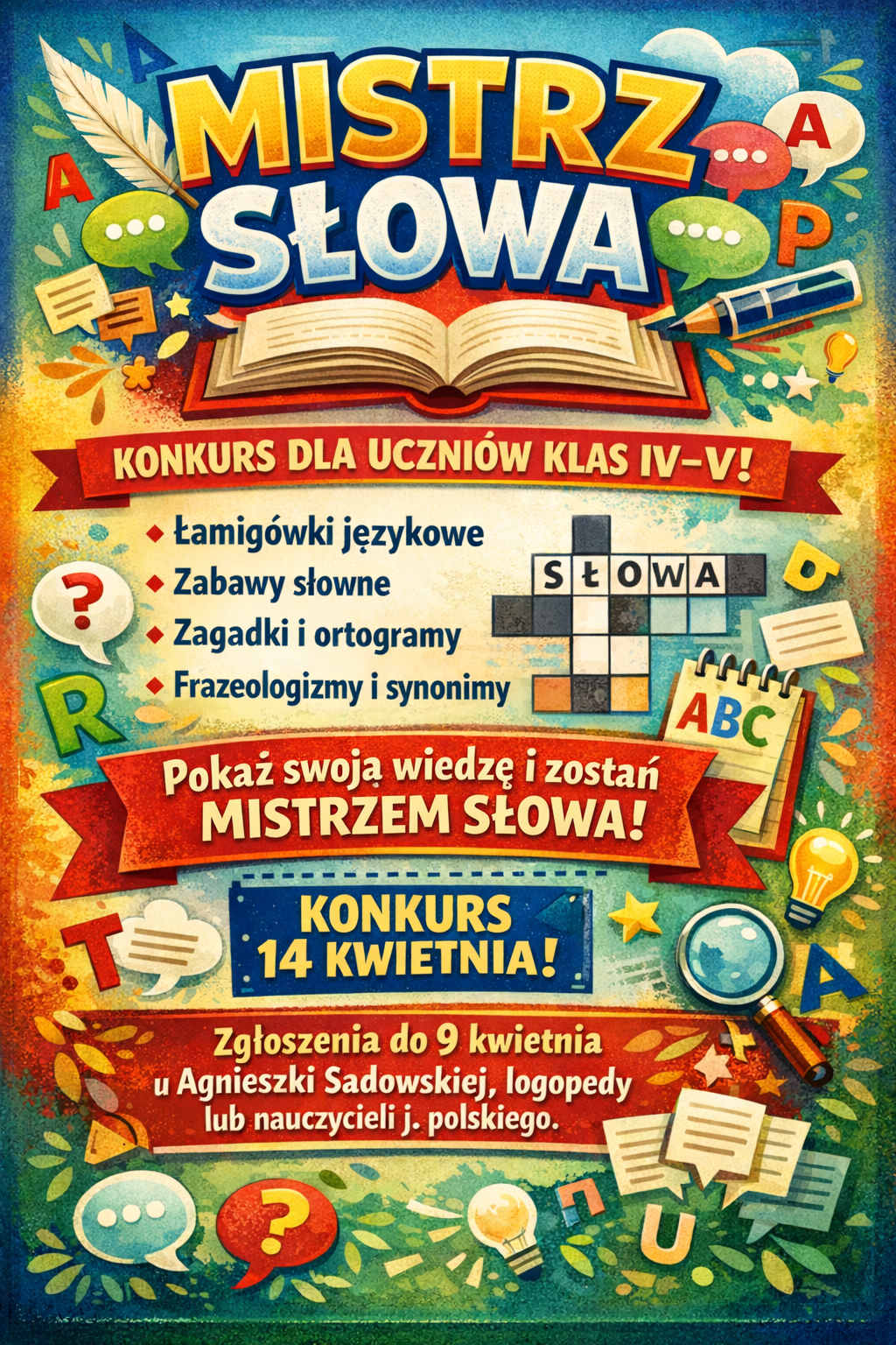 Lubisz bawić się słowem, rozwiązywać zagadki i chcesz sprawdzać swoje umiejętności językowe? Weź udział w szkolnym konkursie „Mistrz Słowa”! Zapraszamy uczniów klas IV–V do zmierzenia się z ciekawymi zadaniami z zakresu słownictwa, ortografii, frazeologii oraz kreatywnego myślenia. To świetna okazja, aby sprawdzić swoją wiedzę, rozwinąć umiejętności językowe i dobrze