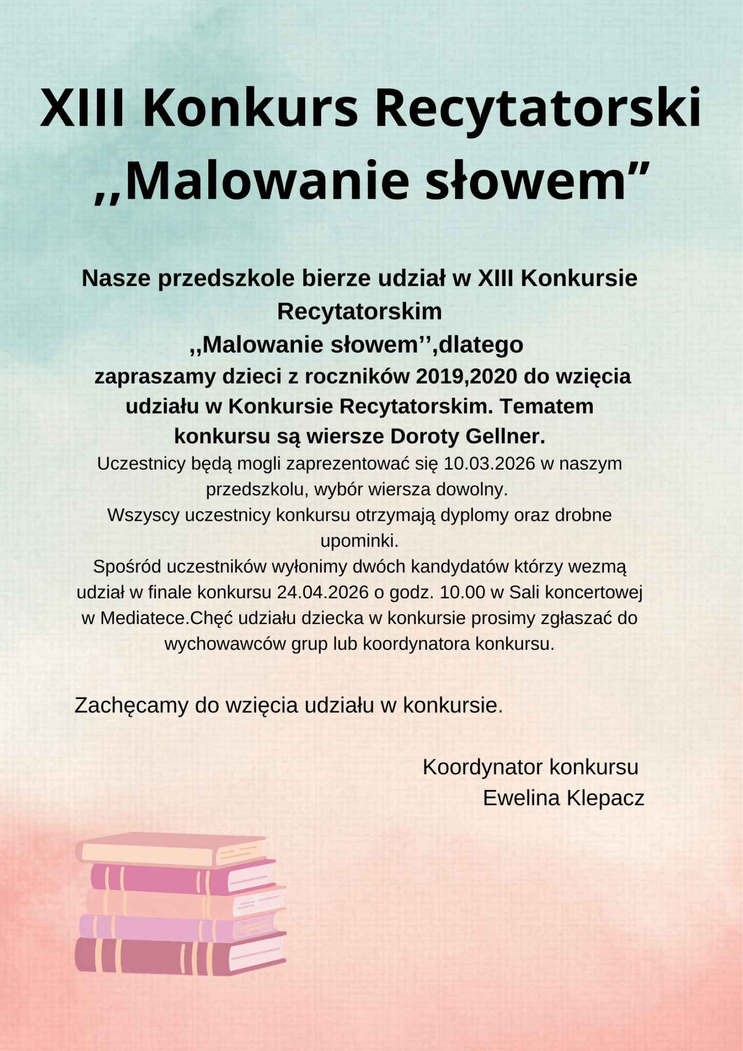 Zapraszamy przedszkolaki z rocznika 2019 i 2020 do wzięcia udziału w konkursie recytatorskim „Malowanie Słowem”. Tematem konkursu są wiersze Doroty Gellner. Pierwszy etap przedszkolny odbędzie się 10.03.2026 r. Spośród uczestników zostanie wyłoniona dwójka dzieci, która weźmie udział w finale konkursu 24.04.2026 roku o godzinie 10:00 w Sali koncertowej w Mediatece.