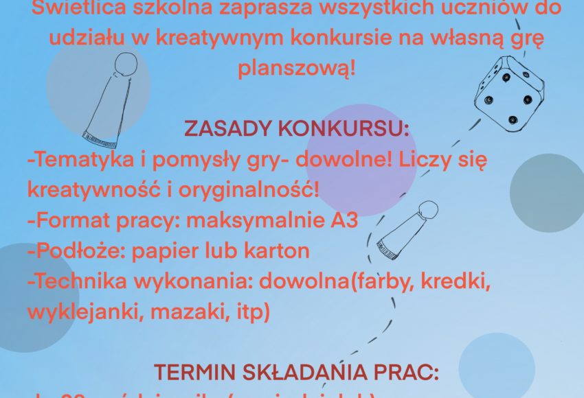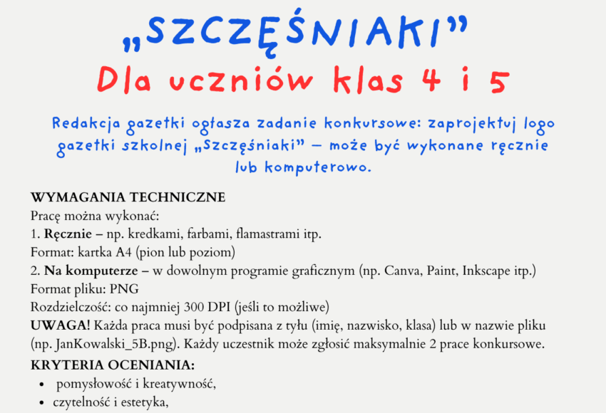 Drodzy Uczniowie klas IV i V! Redakcja gazetki ogłasza zadanie konkursowe: zaprojektuj logo gazetki szkolnej „Szczęśniaki” – może być wykonane ręcznie lub komputerowo. WYMAGANIA TECHNICZNE: Pracę można wykonać: 1. Ręcznie – np. kredkami, farbami, flamastrami itp. Format: kartka A4 (pion lub poziom) 2. Na komputerze – w dowolnym programie graficznym (np. Canva, Paint, Inkscape […]
