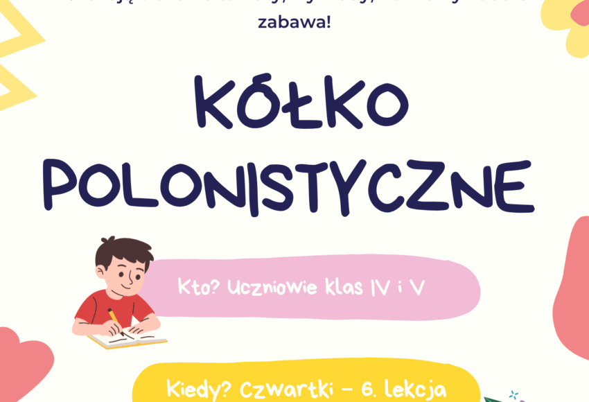 Zapraszamy uczniów klas IV i V na KÓŁKO POLONISTYCZNE! Masz lekkie pióro? Lubisz pisać, wymyślać, tworzyć lub ilustrować? Dołącz do zespołu redakcyjnego naszej gazetki szkolnej „Szczęśniaki”! Czekają ciekawe tematy, wywiady, konkursy i dobra zabawa! Zajęcia odbywają się w czwartki na 6. lekcji (12:40 – 13:25) w sali polonistycznej 210. Opiekun […]