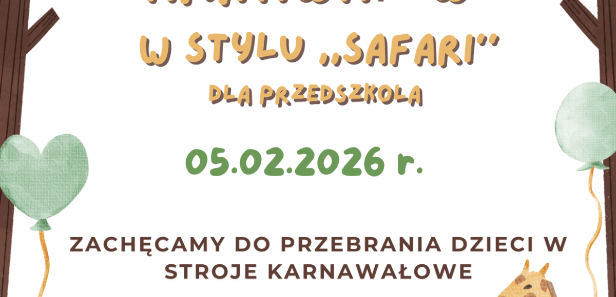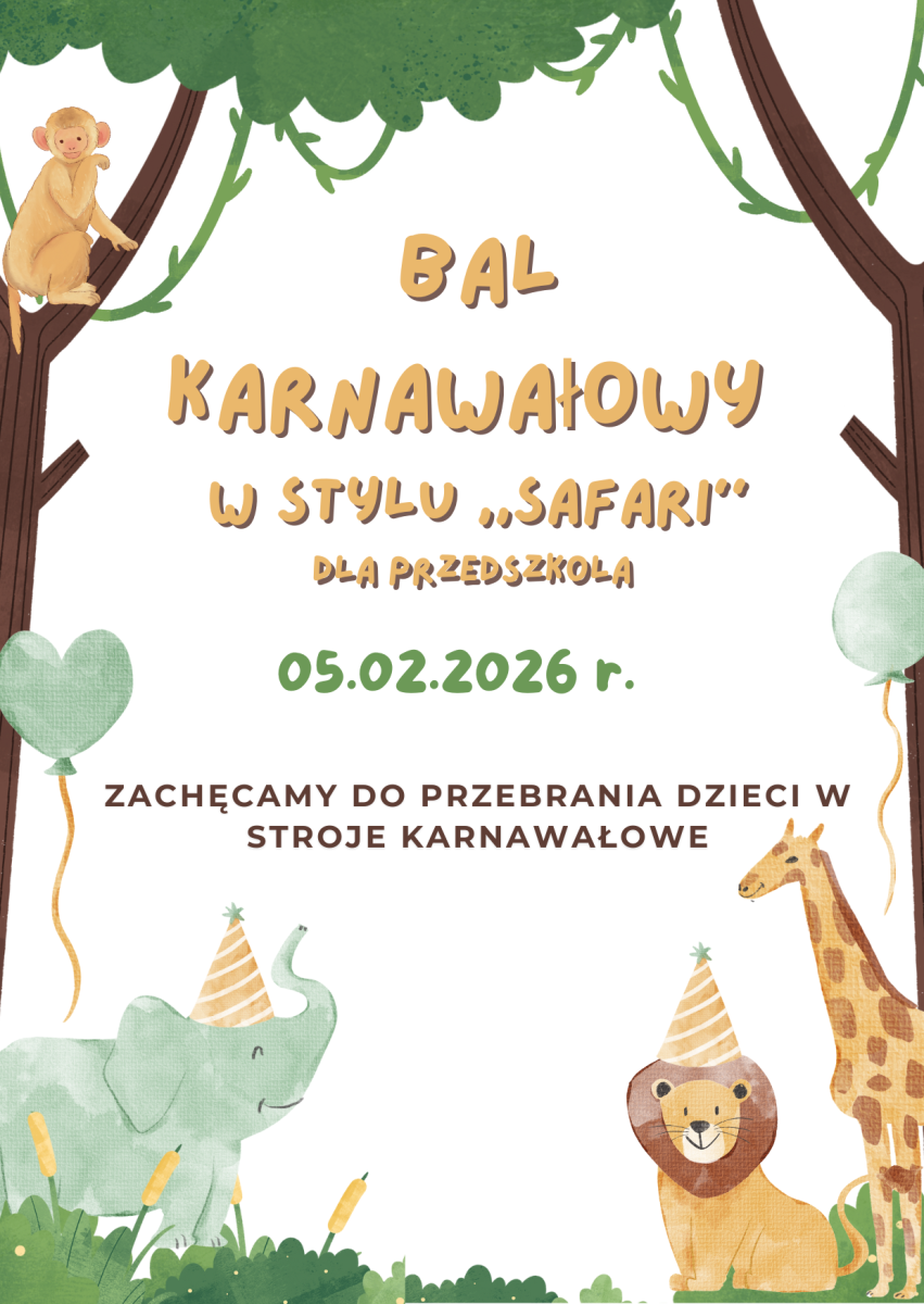 22.01.2026 Bal karnawałowy w przedszkolu! Zapraszamy wszystkie przedszkolaki 05.02.2026 r. na bal karnawałowy w stylu Safari. Zapewniamy świetną zabawę:)