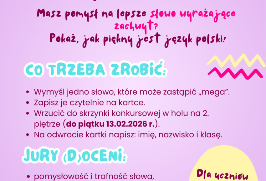 REGULAMIN SZKOLNEGO KONKURSU JĘZYKOWEGO „Zastąp słowo MEGA! ” §1. Organizator Organizatorem konkursu są nauczycielki języka polskiego Szkoły Podstawowej w Szczęsnem. §2. Uczestnicy Konkurs przeznaczony jest dla uczniów klas IV–V Szkoły Podstawowej w Szczęsnem. §3. Zadanie konkursowe 1. Zadaniem uczestnika jest zaproponowanie jednego słowa, które najlepiej oddaje zachwyt i może zastąpić […]