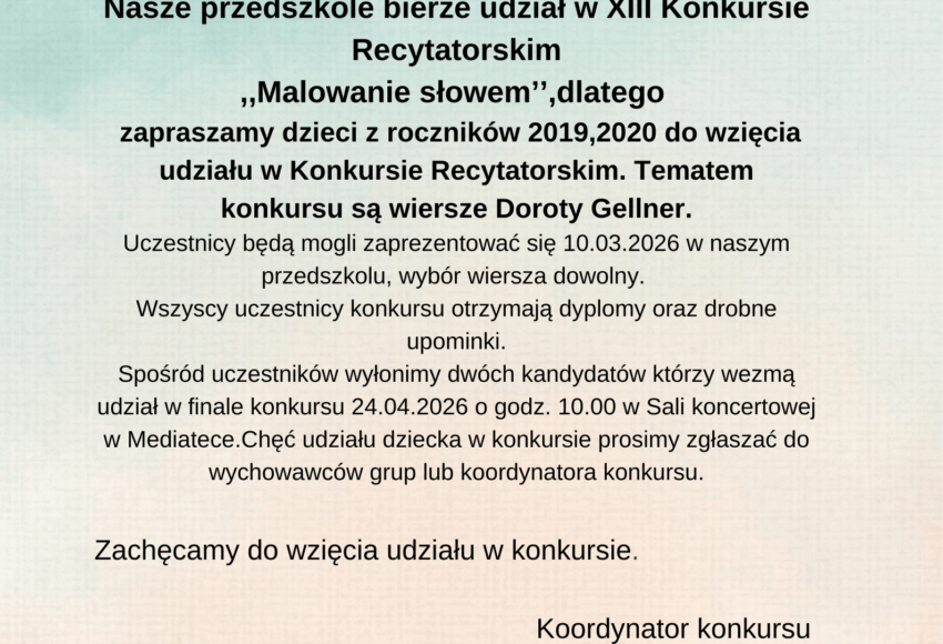 Zapraszamy przedszkolaki z rocznika 2019 i 2020 do wzięcia udziału w konkursie recytatorskim „Malowanie Słowem”. Tematem konkursu są wiersze Doroty Gellner. Pierwszy etap przedszkolny odbędzie się 10.03.2026 r. Spośród uczestników zostanie wyłoniona dwójka dzieci, która weźmie udział w finale konkursu 24.04.2026 roku o godzinie 10:00 w Sali koncertowej w Mediatece.