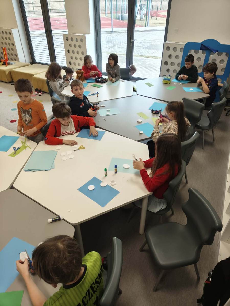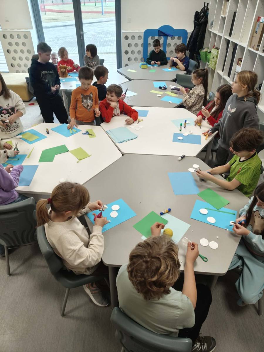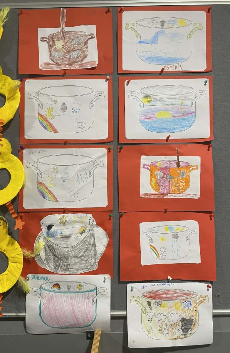 Dzieci w świetlicy z dużym zaangażowaniem wykonały prace plastyczne w klimacie świąteczno-wiosennym. Powstały kolorowe kurczaczki, które wprowadziły radosny nastrój zbliżających się świąt. Uczniowie stworzyli także prace inspirowane powiedzeniem „w marcu jak w garncu”, przedstawiające zmienną, marcową pogodę. Dodatkowo dzieci wykonały „okna wiosenne”, pełne kwiatów, słońca i barwnych motywów, które pięknie rozjaśniły przestrzeń świetlicy.