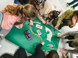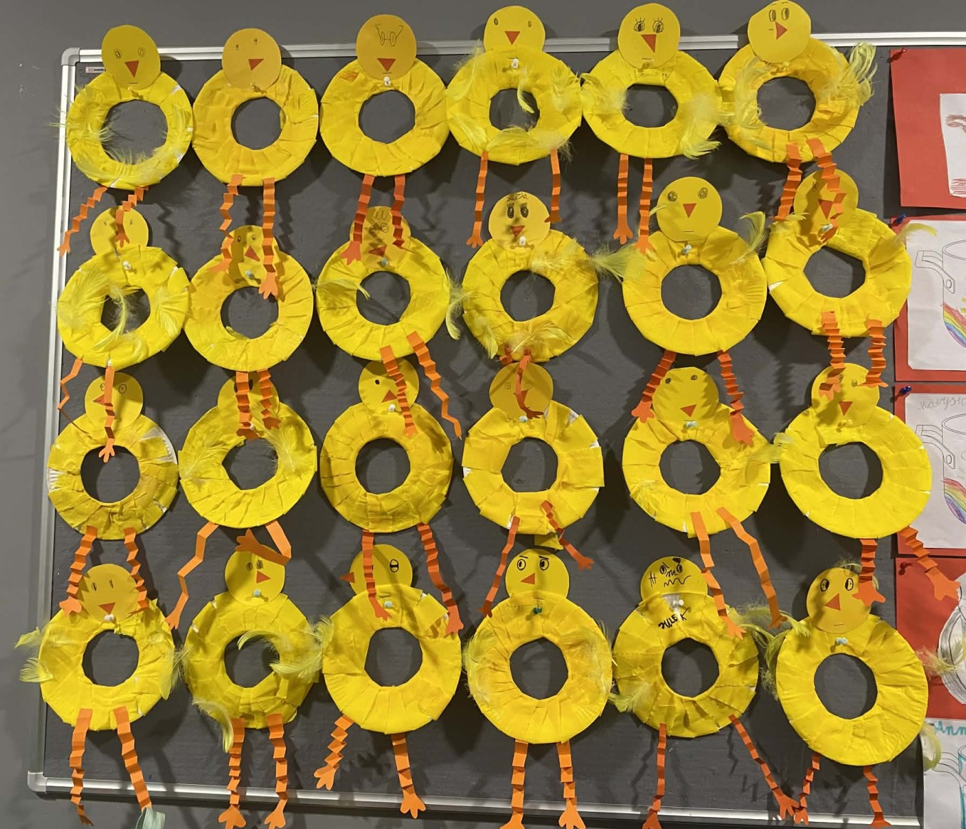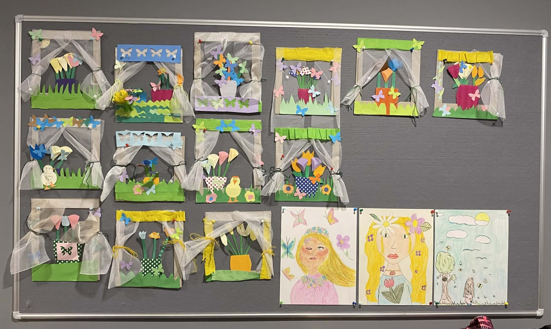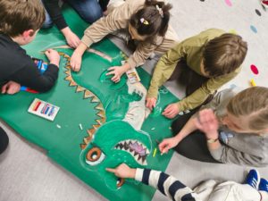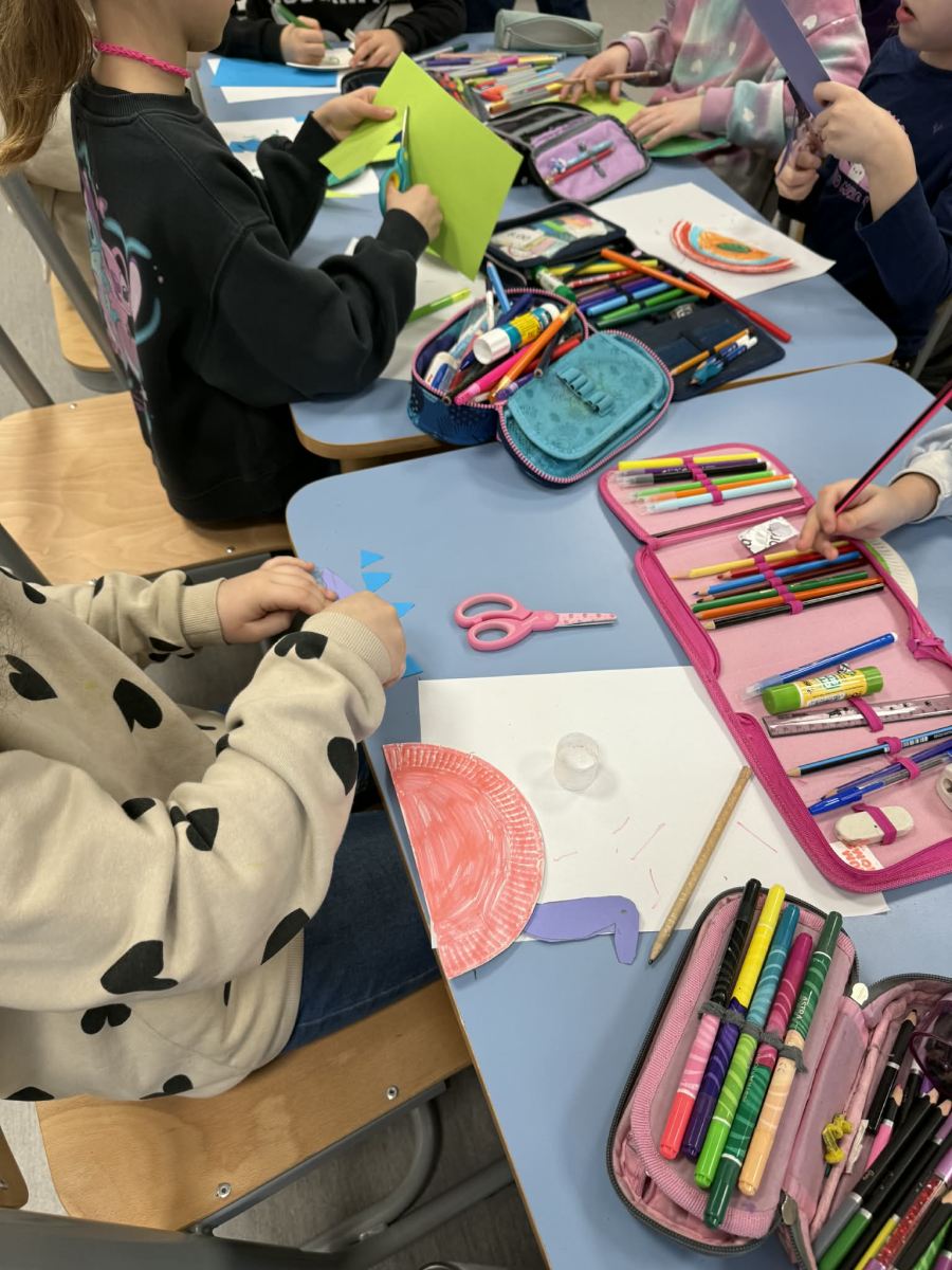 Dzieci w świetlicy z dużym zaangażowaniem wykonały prace plastyczne w klimacie świąteczno-wiosennym. Powstały kolorowe kurczaczki, które wprowadziły radosny nastrój zbliżających się świąt. Uczniowie stworzyli także prace inspirowane powiedzeniem „w marcu jak w garncu”, przedstawiające zmienną, marcową pogodę. Dodatkowo dzieci wykonały „okna wiosenne”, pełne kwiatów, słońca i barwnych motywów, które pięknie rozjaśniły przestrzeń świetlicy.