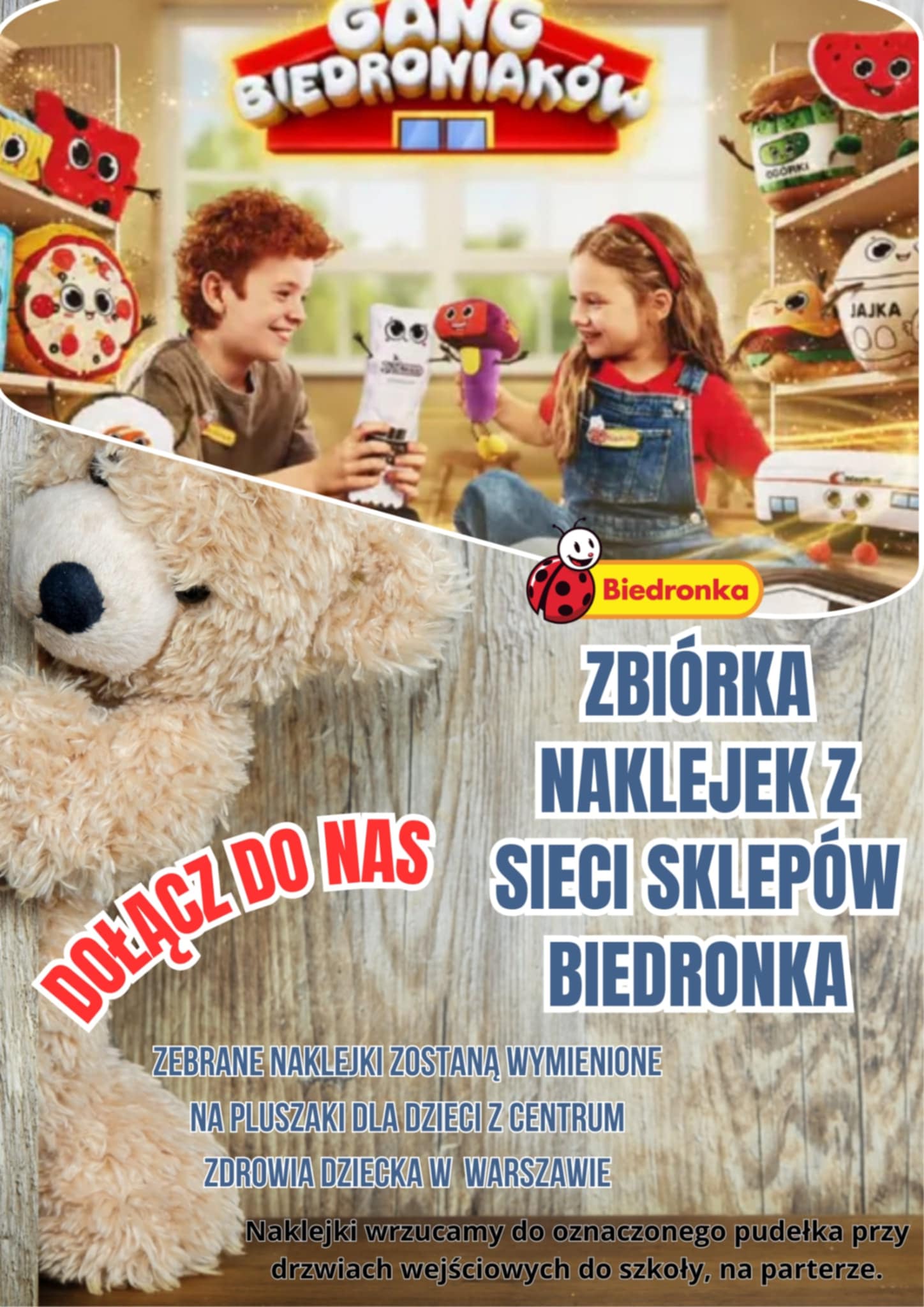 Samorząd Uczniowski zaprasza do udziału w akcji „Biedroniaki w naszej szkole”. Nasza akcja ma na celu pozyskanie pluszaków w ramach wymiany naklejek i przekazanie maskotek dzieciom przebywającym w Centrum Zdrowia Dziecka. Za zakupy w Biedronce można otrzymać specjalne naklejki. Zebrane przez nas naklejki wymienimy na pluszaki i książki, które trafią