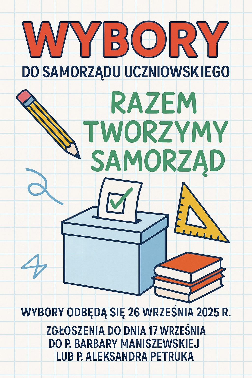 Drodzy Uczniowie, rozpoczynamy ważny i wyjątkowy czas w życiu naszej szkoły – wybory do Samorządu Uczniowskiego! To doskonała okazja, by włączyć się w życie szkoły, rozwijać swoje talenty organizacyjne i reprezentować interesy całej społeczności uczniowskiej. Chcesz kandydować? Zgłoś się do 17 września do p. Barbary Maniszewskiej lub p. Aleksandra Petruka